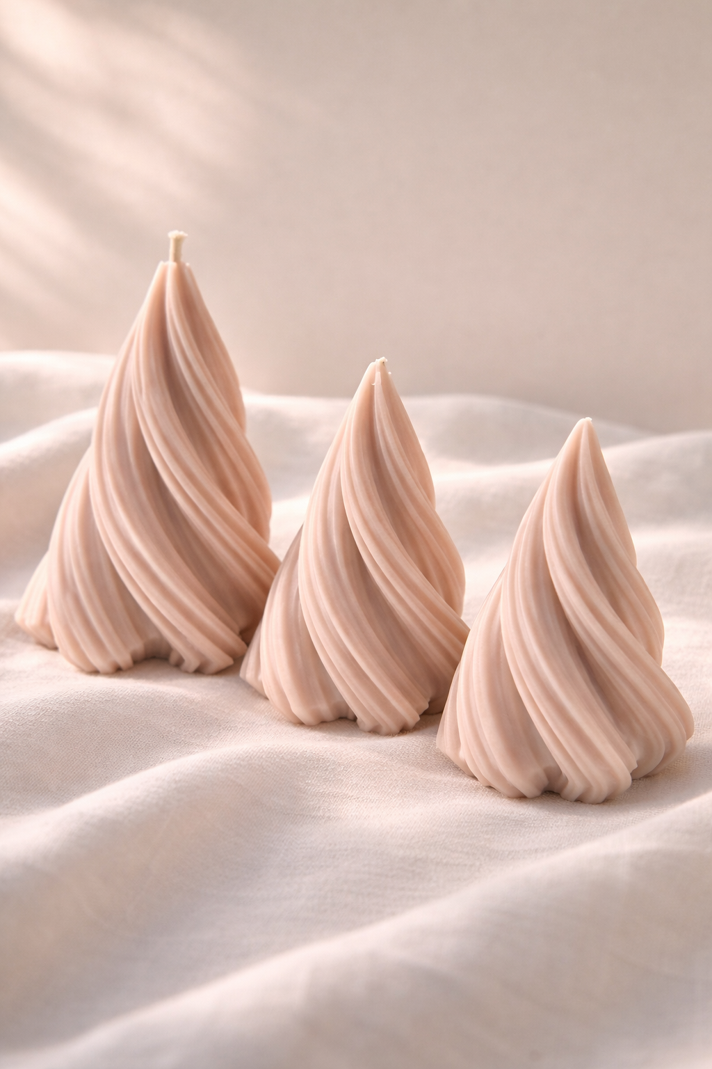 Um conjunto de três velas esculturais moldadas à mão, onde a forma se constrói em movimento contínuo e envolvente.